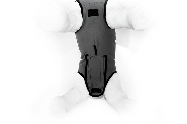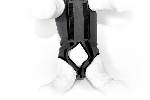 Der BonniBody - "Medi-Body" Modell R Plus hat die gleichen Eigenschaften wie das Model RH Standard + zusätzlich eine "Pippiklappe". Das Modell wurde auf Wunsch einiger Kunden entwickelt um das Gassigehen zu erleichtern. Der Body muss nicht ausgezogen werden. Die Klappe wird nach vorne weggeklappt und an einem Klettpunkt befestigt, um eine Verschmutzung zu verhindern.
