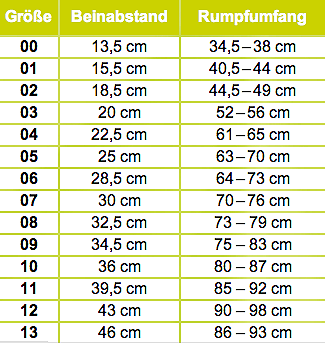 14 verschiedene Größen (von 00 bis 13) ermöglichen eine sehr gute Passgenauigkeit beim Beinabstand. Zusätzlich kann der Brustumfang durch einen verstellbaren Klettverschluss auf dem Rücken geregelt werden.