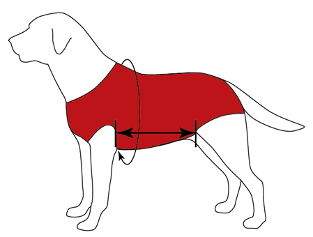 > Messen Sie an der gekennzeichneten Stelle den Beinabstand und den Rumpfumfang direkt hinter den Vorderläufen.